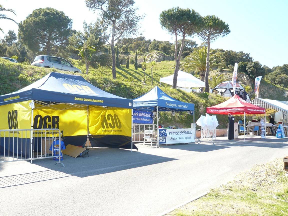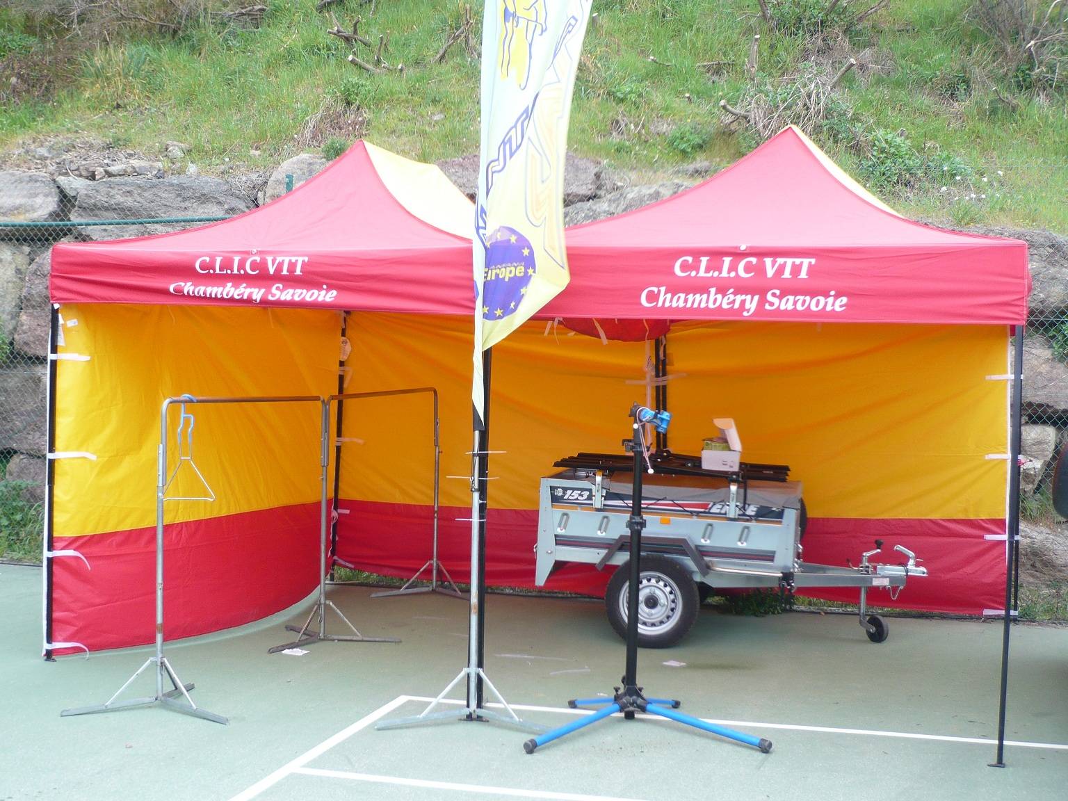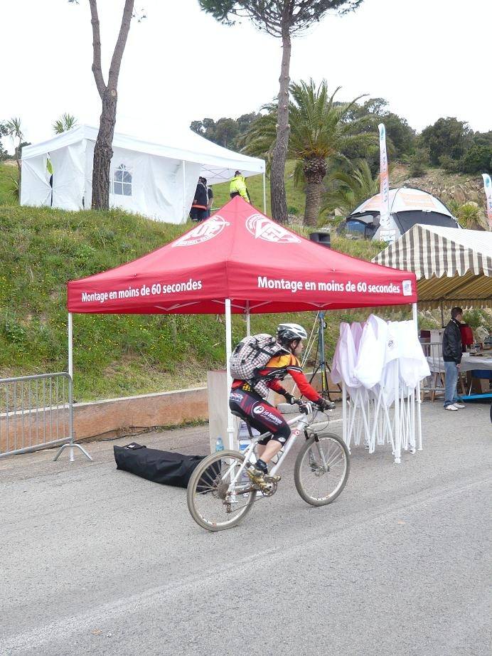 Un parc d'assistance sur la Coupe de France VTT où les tentes pliantes E-Z UP se jouent de la pluie et du soleil.