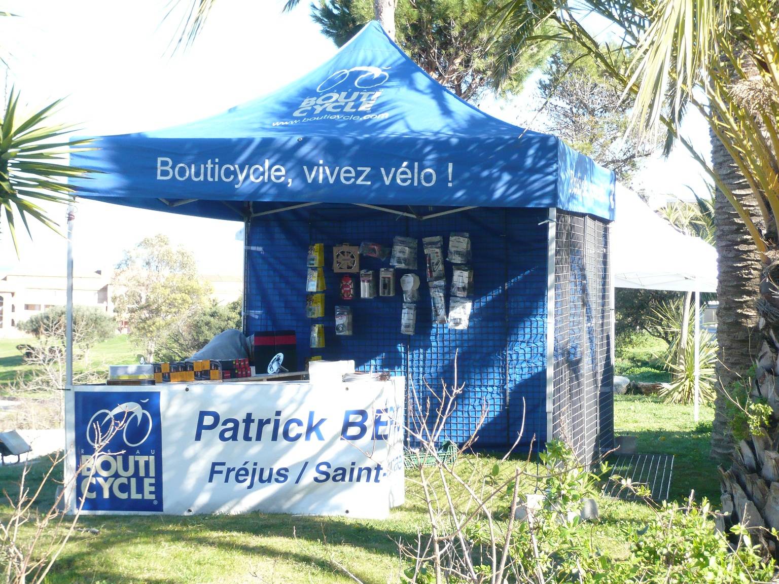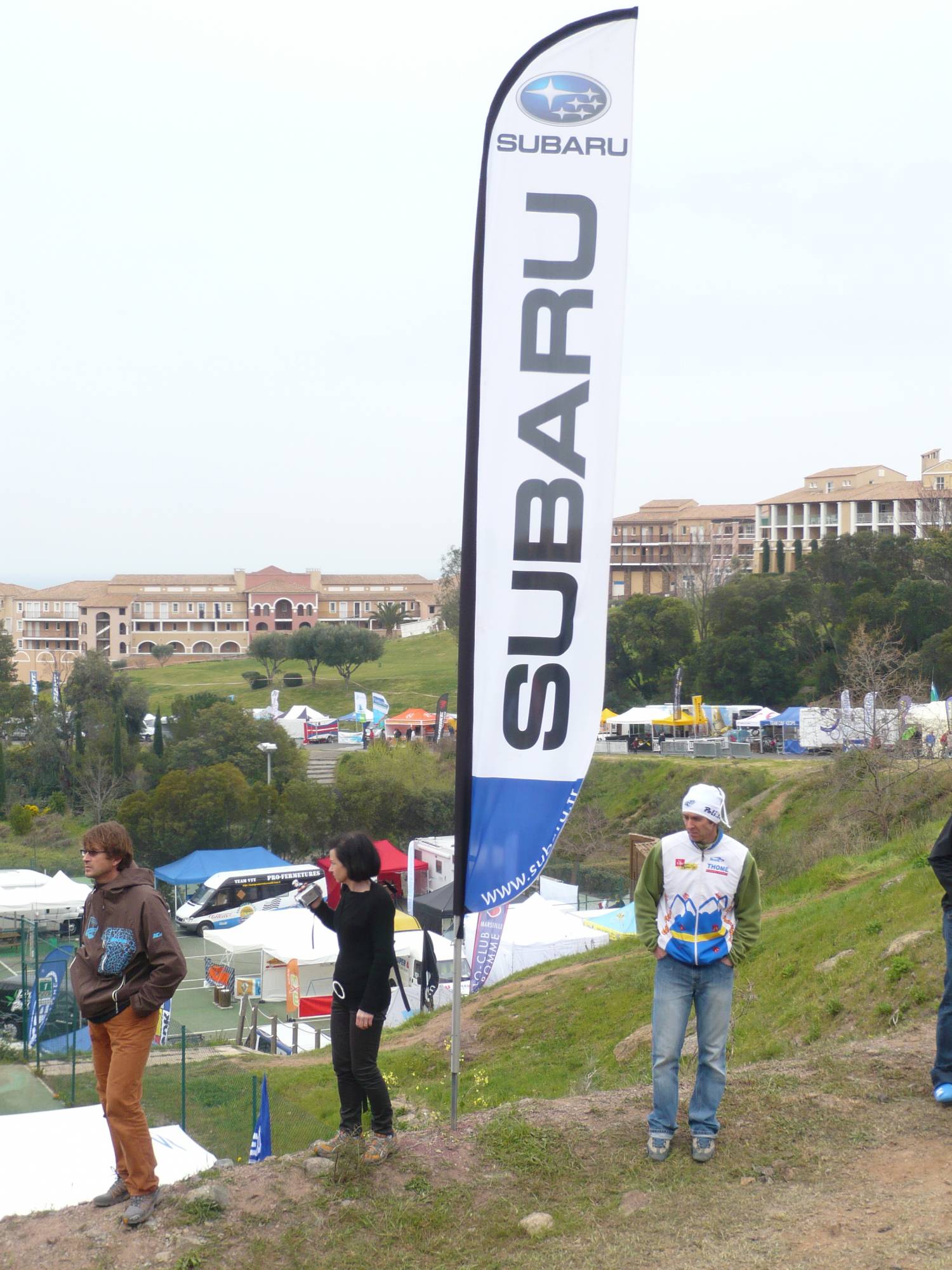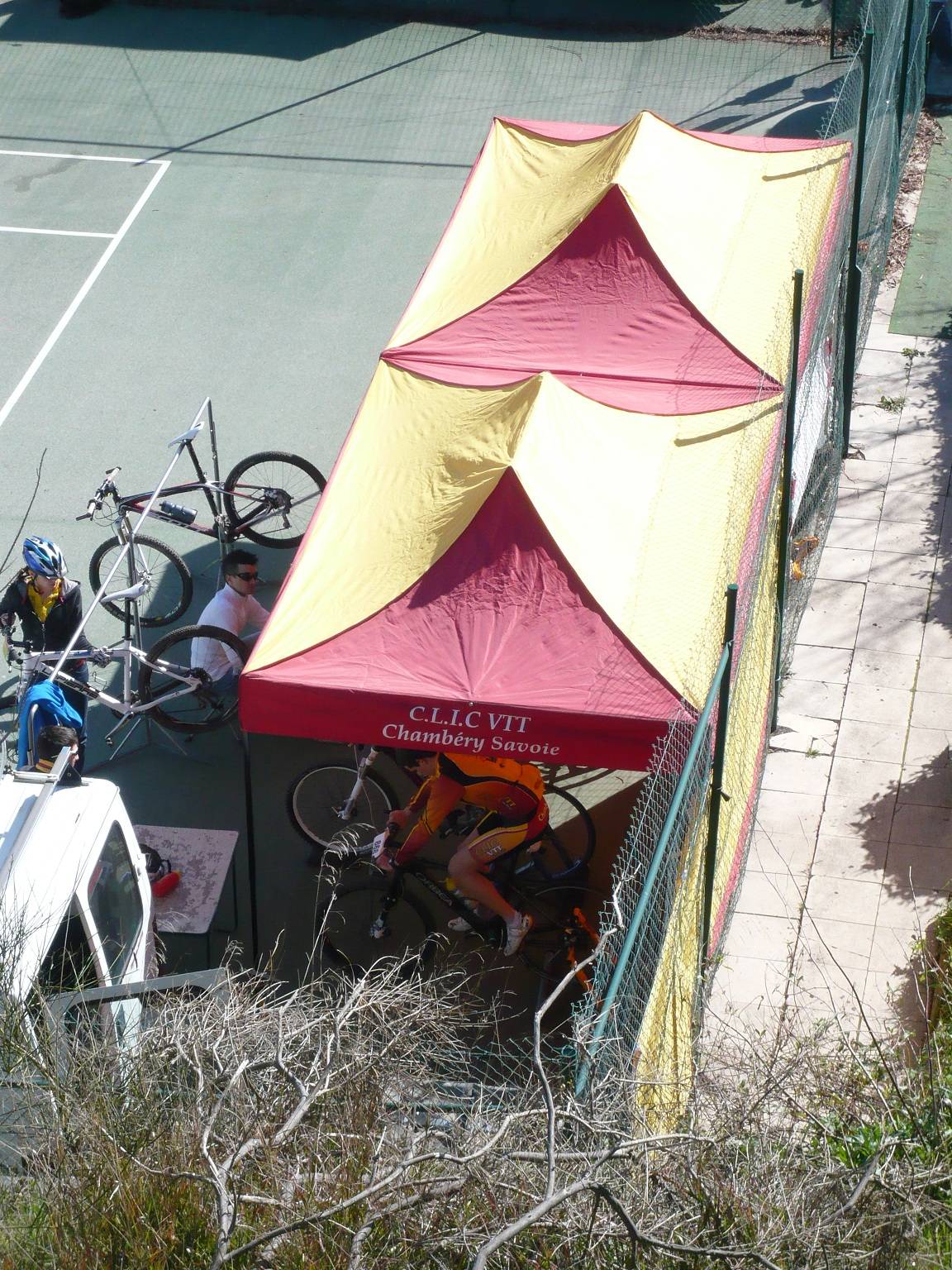 Un parc d'assistance sur la Coupe de France VTT où les tentes pliantes E-Z UP se jouent de la pluie et du soleil.